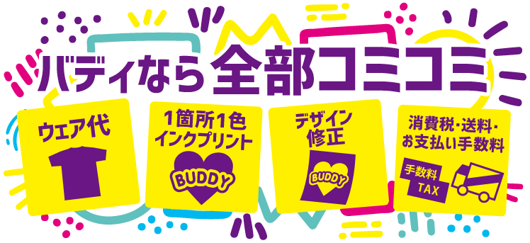 文化祭・体育祭のクラスTシャツや部活のTシャツ作りはバディにおまかせください!自社工場直販だから可能なサービス、安い価格でのご提供が可能です。