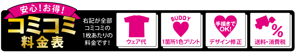 ※プリント場所を増やしたり色数を増やす場合は、1箇所1色ごとに上記追加料金を足してください。