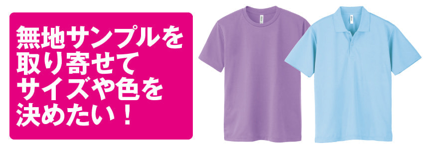 お届け日までに余裕がある場合は、無地サンプル貸出をご利用頂き、Tシャツを手に取ってサイズや色を確認して頂けます。色確認のサンプルは2色まで同送致します。