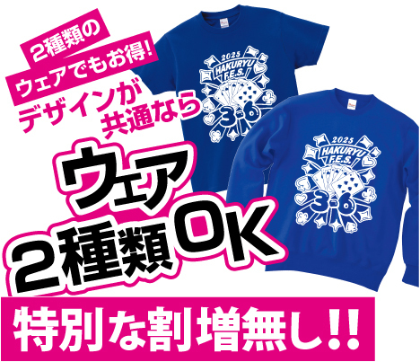 ※デザインが共通なら、ウェアの種類が2種類でもお得に作れます。例えばTシャツ30枚、パーカー10枚 合計40枚のご注文ならどちらも40枚の価格帯になります。ただし、デザインを含めプリント場所やプリントカラーも共通の場合に限ります。